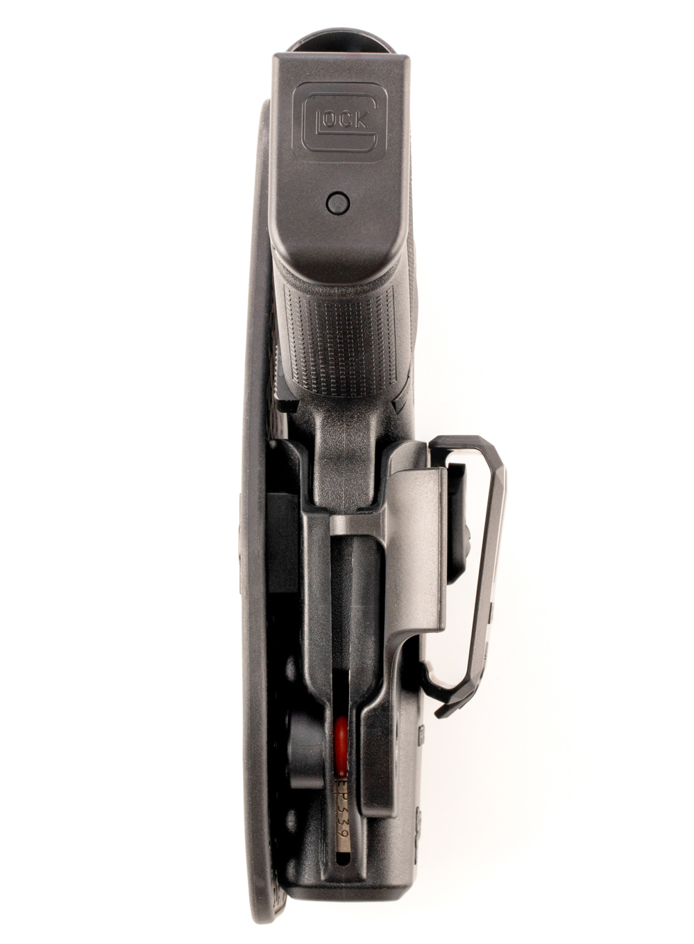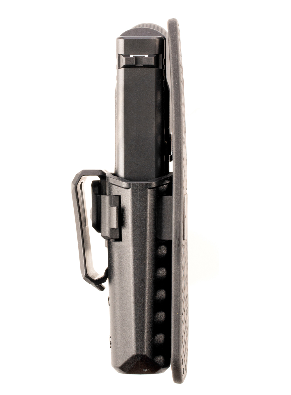If using a paddle, first dismantle the belt clip, sweat guard, and concealment wing. Then, click the paddle into the sweat-guard location. Place the holster on your hip and make sure the paddle is pushed down on your belt.