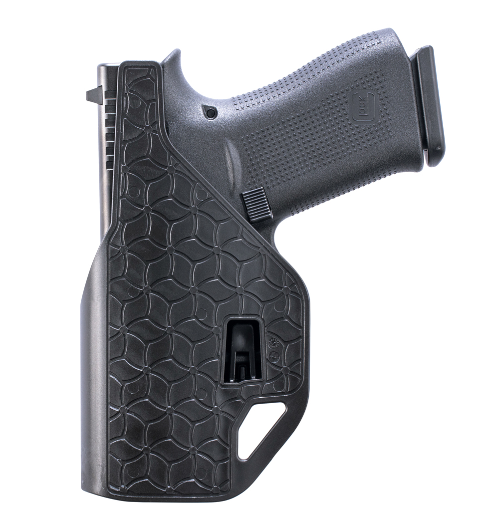 It is an IWB holster that is as comfortable as it is rugged. No metal components, no moving parts, a one-piece lean polymer body. The polymer construction makes it extremely lightweight and low profile. The slim, minimal sweat guard provides an effective barrier between your body and the firearm while, at the same time, allowing you to holster and unholster when needed rapidly. The C holster is carried with a fully tuckable C clip. It should be worn at 3, 4, or 5 o’clock position.