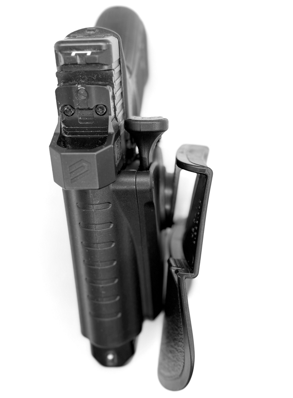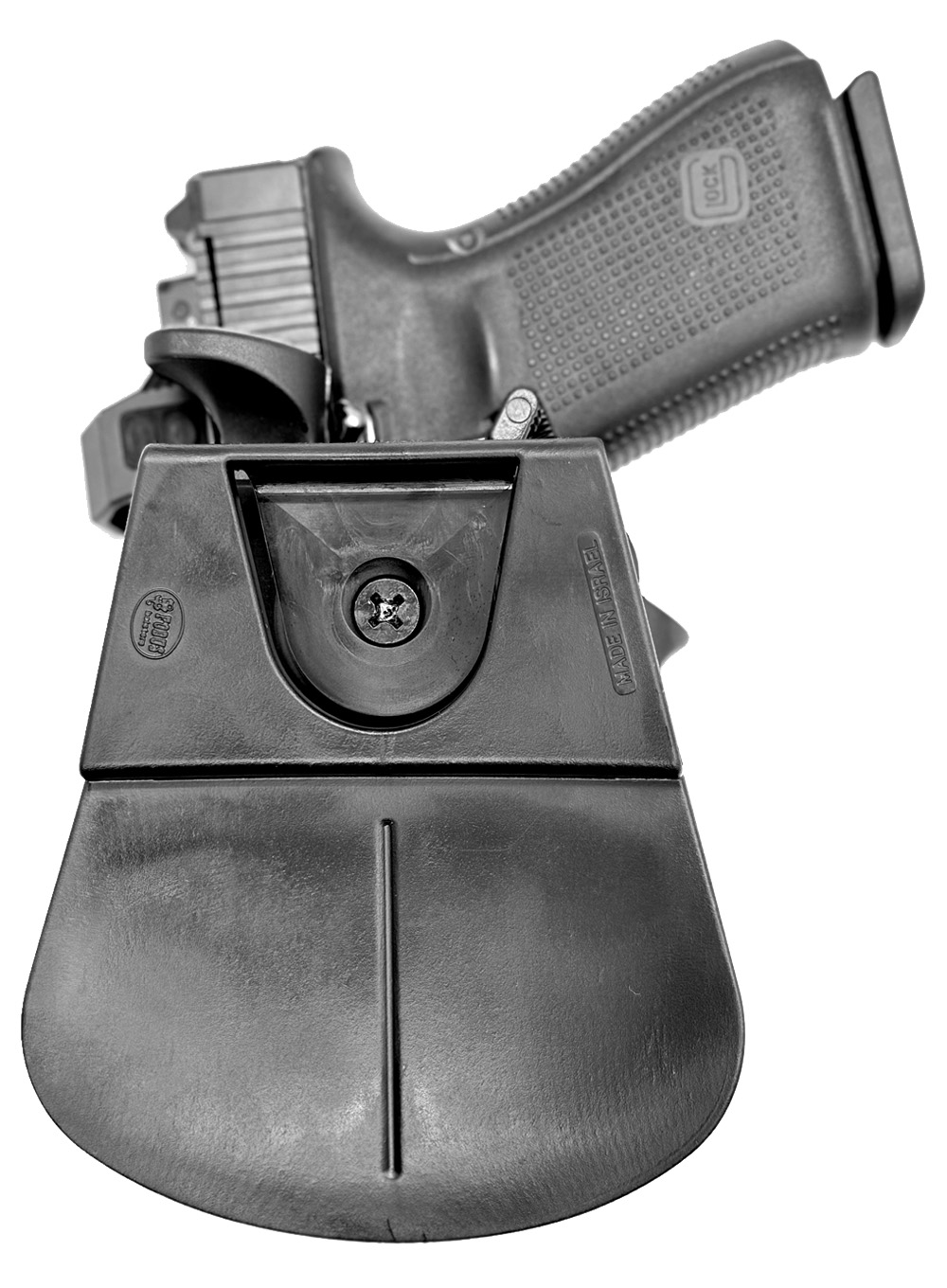 Tighten your belt. Place the holster on your hip and make sure the paddle is pushed all the way down on your belt. Make sure the level II safety is open. To release and draw push the thumb release downwards while taking grip of the gun.