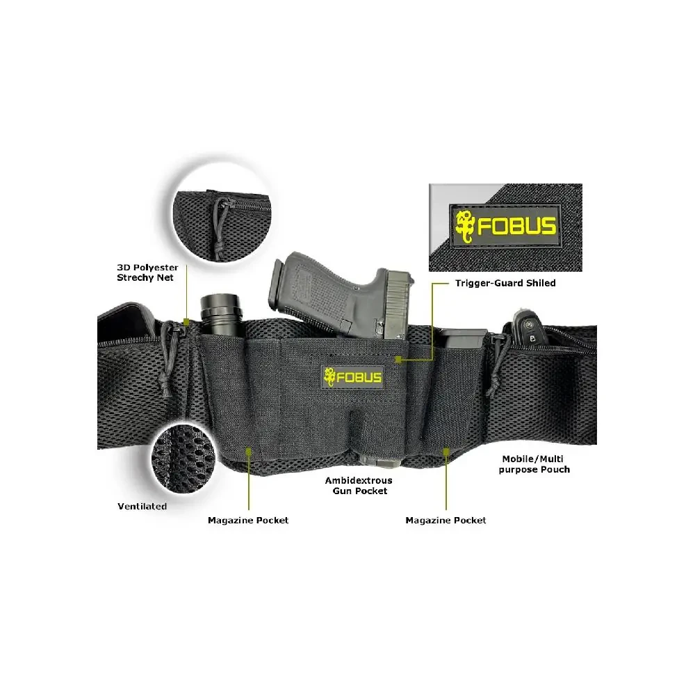 To create the right-snug fit for your TacticBand, exhale all your air to reduce the abdomen volume on which you stretch the belt. Stretch the TacticBand tightly by pulling the straps’ ends toward one another. The straps’ ends should be tightened in front of your body, while the Fobus logo should be on your back. Once tightly stretched, place it in your preferred location by pulling/twisting it. Now, you can insert your gun.
